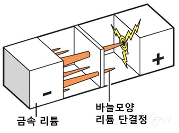 2. 리튬 금속을 이용한 배터리를 재충전하면 리튬 덴드라이트가 형성된다. 이는 안전상의 문제로 오랫동안 이슈가 됐다(Park et al., 2008).