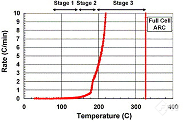3. 마지막 세 번째 단계는 온도가 분당 100℃까지 상승하는 고속 발열 단계가 특징이며 180℃ 이상의 온도에서 발생한다. 이때 양극은 빠르게 분해되고 구조 내 산소가 탈리된다. 또 열폭주로 이어져 눈 깜짝할 사이에 온도가 수백℃ 이상 올라간다.