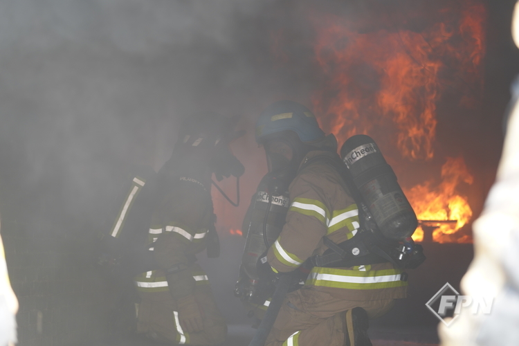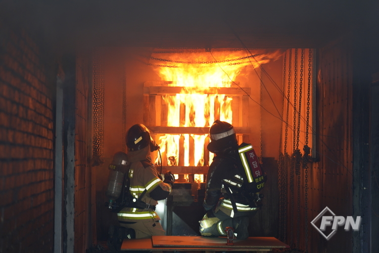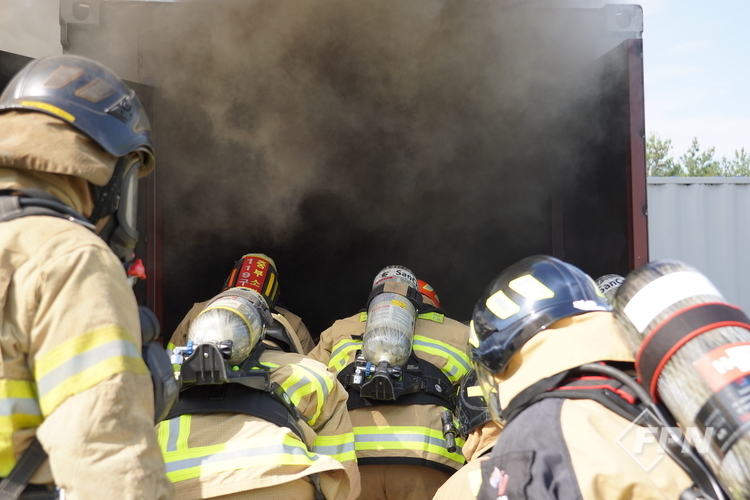 세미나에선 주수 기법ㆍ각도별 화점에 미치는 영향을 살펴보는 훈련과 화재 위험성을 줄이면서 건물에 진입하는 ‘화재실 내부 진입절차(도어 엔트리)’, 주수 기법에 따라 물이 천장 어느 부분까지 닿는지를 알아보는 훈련이 진행됐다. 이후 실제 컨테이너 공간(셀)에서 화재 상황을 연출하는 실화재 훈련이 이어졌다.