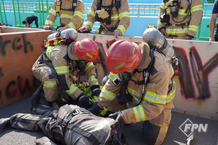 장비 체결이 완료되고 진행 요원이 면체에 붙은 테이프를 떼어내자 바닥에 쓰러져 있는 구조대상자가 시야에 들어왔다. 이들은 즉시 구조대상자 의식과 공기 잔량을 확인했다. 공기호흡기가 탑재된 RIT팩을 이용해 공기를 공급하기도 했다.