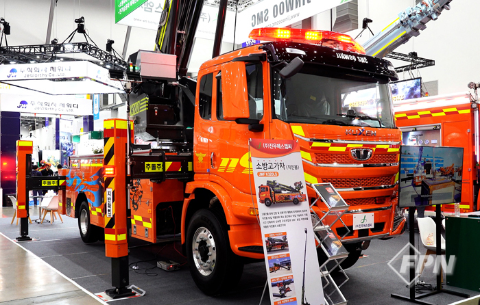 특장 분야 종합서비스 전문기업 (주)진우에스엠씨(대표 이준호)는 32m 직진붐식 소방고가차와 전기차 화재진압용 소방차를 선보였다.