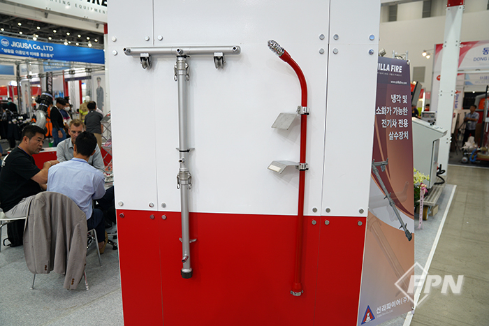 특수 방수총과 관창 등 소방기계ㆍ장비 전문기업 신라파이어(대표 이정규)는 전기차 화재에 효과적으로 대응하기 위한 전용 살수장치 솔루션을 선보여 이목을 끌었다.