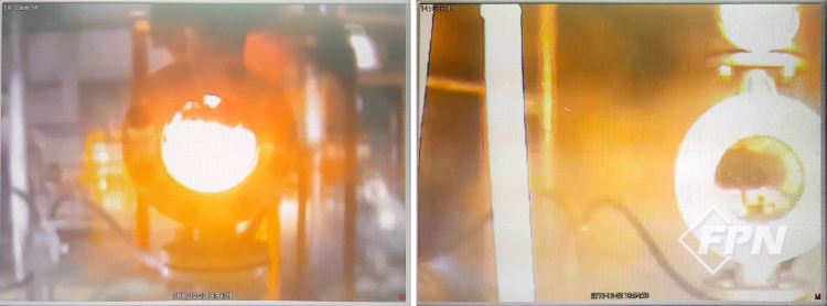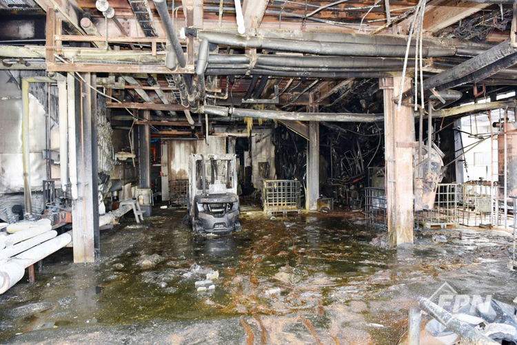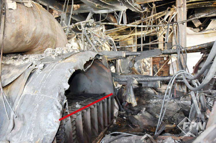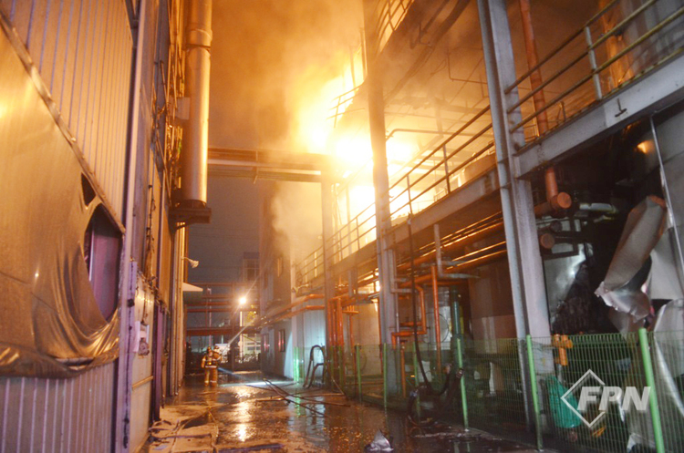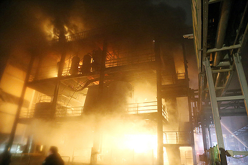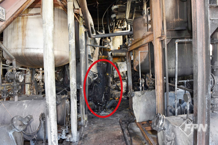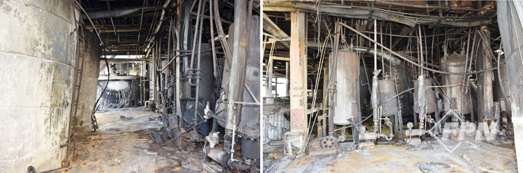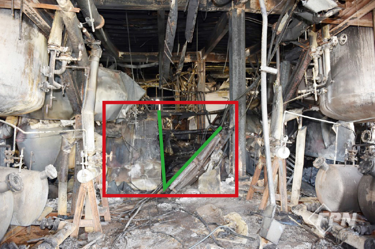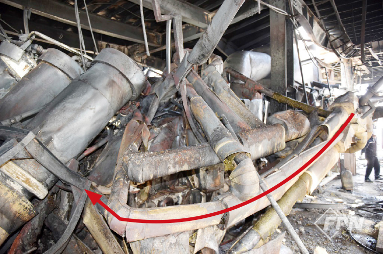 3층 외벽의 시설물 일부가 용융되고 만곡돼 소락한 형태로 관찰된다. 화염이 있는 곳이 3층 증발기 1호가 있는 지점이다.