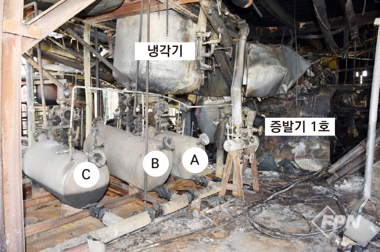 그런데 화재 사고가 발생한 증발기 1호는 부스터 펌프에 이상이 생겨 누유가 발생하는 걸 수리하고자 진공펌프와 부스터 펌프의 가동을 중단하고 열 매체유 공급 배관을 잠근 뒤 질소 퍼지 약 20분 후부터 부스터 펌프를 해체하기 시작했다.