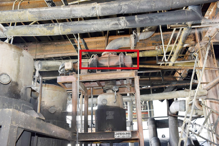사고 증발기에 설치된 LT는 작동전압 DC 24V이며 전류는 40㎃로 확인됐다. 열 매체유 배관 온도는 180℃로 바이오 디젤을 데우고 여기서 발생하는 증기를 부스터 펌프, 즉 진공펌프를 이용해 ①, ②, ③ 냉각기 방향으로 이동시킨다.