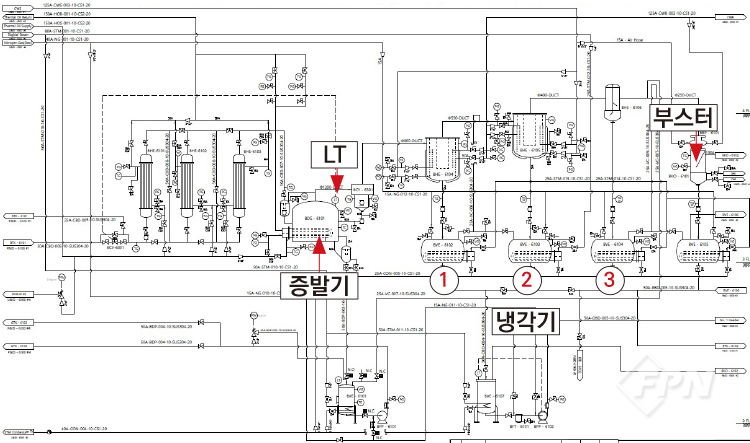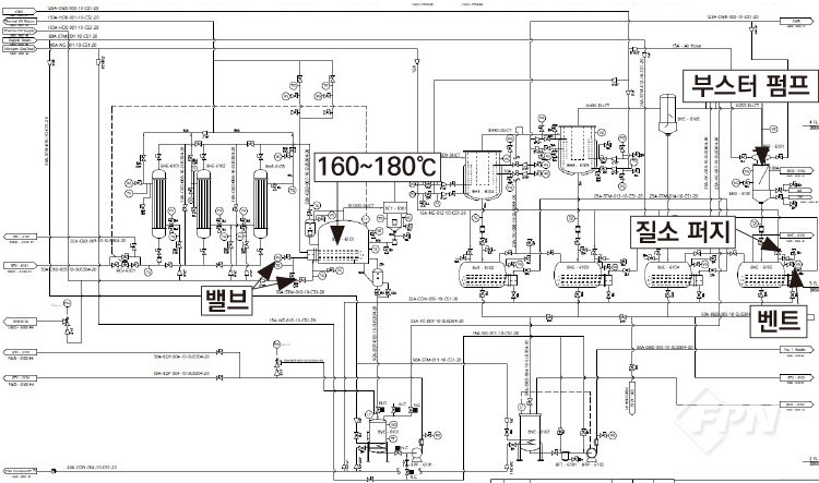 배관 내 산소를 차단하기 위해 [그림 2] 위치에서 질소 퍼지를 시행했고 20분 후 부스터 펌프 해체 작업을 시작했다. 부스터 펌프 볼트 3개가 풀린 게 확인되고 증발기 내부가 음압에서 질소 퍼지 후 대기압으로 변경된 상태다.