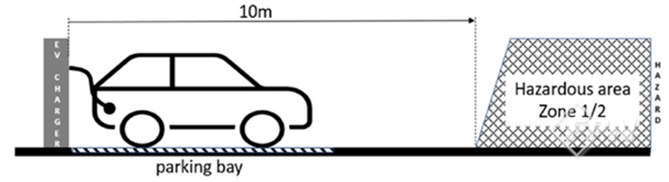 1. 충전설비 RC59 version 2(2023)의 3.3.5 에서는 ‘발화성 액체 저장고와 같은 위험 설비가 있는 경우 EV 충전 지점은 ‘위험 구역(ATEX 기준 Zone 1 또는 2)’의 가장자리에서 최소 10m 떨어져 있어야 한다.