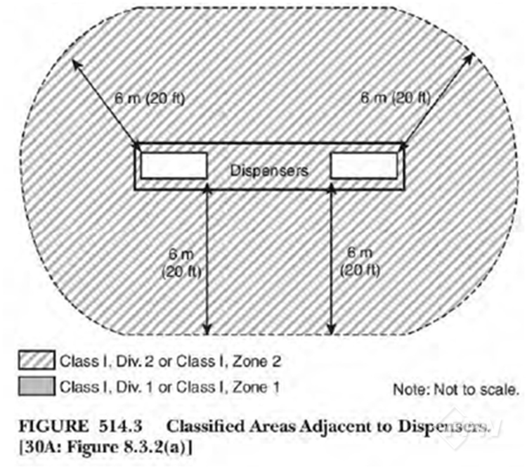 514.3절에서는 주유 디스펜서와 인접한 곳에 구분된 장소를 표시하고 디스펜서로부터 6m 떨어진 거리에 설치하도록 규정했다.