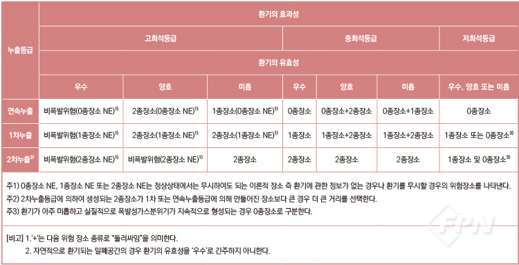 아래 위험장소 구분 기준 표를 참고하면 좀 더 쉽게 이해할 수 있을 거다. 환기 설계를 잘한다면 폭발위험장소를 비폭발위험장소로 충분히 변경시킬 수 있다.