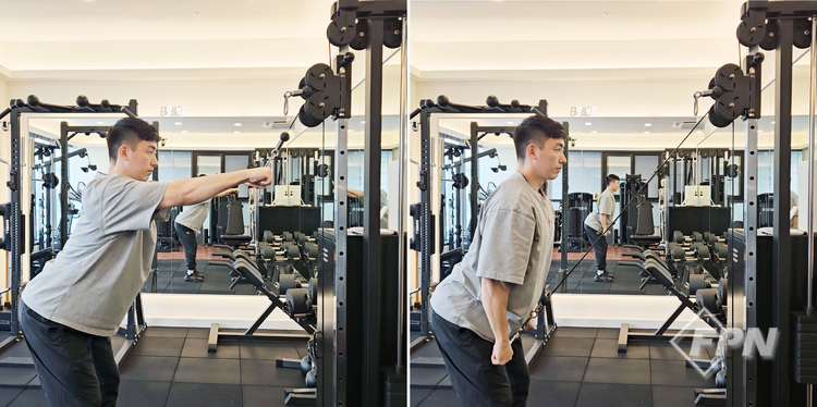 2. 또 이런 포지션에서는 케이블로 인해 내 몸의 균형을 잡기가 쉽지 않기 때문에 벤트 오버 자세로 전환해 주는 걸 추천합니다.