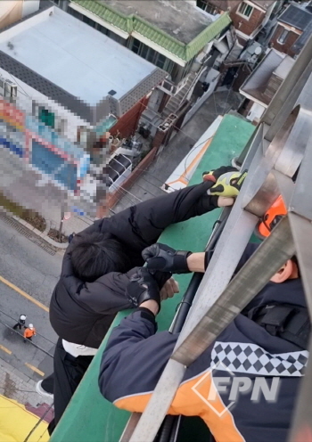 소방서는 이날 오전 7시 15분께 한 남성이 건물 옥상 난간에 서있다는 신고를 받고 출동했다.