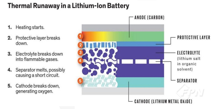 - 리튬이온배터리 품질(Quality): 리튬이온배터리가 과충전되면 그라파이트(Graphite) 입자에 ‘리튬금속석출(Lithium Metal Plating)’이 발생합니다. 리튬금속은 용매(solvent)와 열 반응해 폭발적이고 유독한 기체(explosive and toxic gases)를 생성합니다.