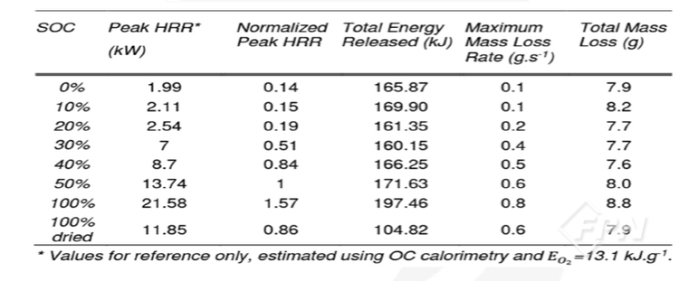 - 100% 충전 상태의 건조 셀(dried cell (역주) 인위적으로 전해질이 없는 상태의 셀)은 40~50% 사이의 충전 상태를 가진 완전한 리튬이온 셀과 유사한 에너지 수준을 방출했습니다. 100% 충전 상태 건조 셀의 최대 열방출률은 50% 충전 상태에서 얻은 것의 86%에 해당합니다. 전해질이 함유된 동일한 리튬이온 셀 최대에너지방출량(peak energy release)의 절반 정도입니다. 이 정보를 기반으로 100% 충전 상태에서 전해질이 에너지 방출의 절반에 이바지한다고 할 수 있습니다.