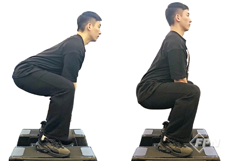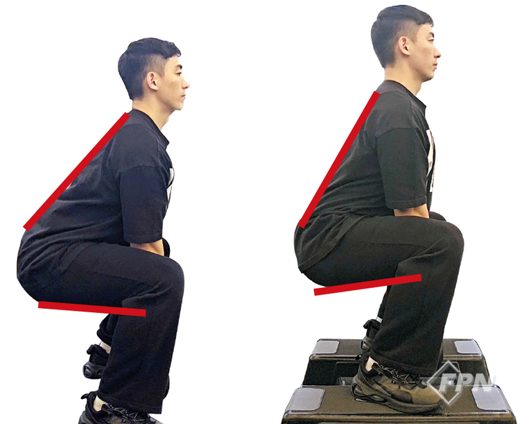 스텝박스를 이용하지 않을 때 앞서 설명했듯이 케틀벨을 이용한 와이드 스쿼트 시 앉으면 케틀벨이 지면과 닿곤 합니다. 그렇다 보니 깊이 앉지 않고 올라오는 경우가 많습니다.