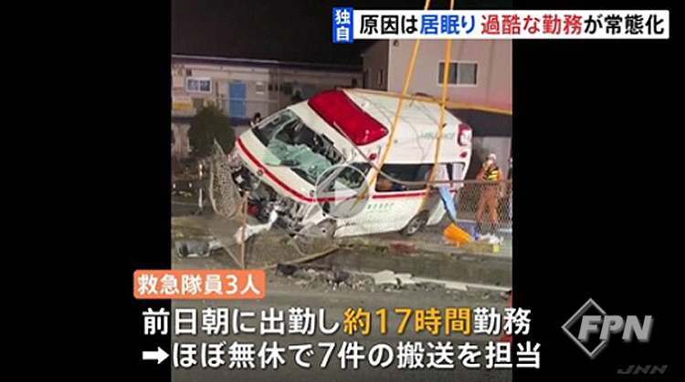 코로나19 펜데믹 이후 급격한 구급 출동 증가로 인해 구급대의 과부하가 지속되는 상황은 비단 한국만 아니라 일본도 마찬가지다. 2022년 12월 29일 오전 1시 50분께 아키시마시 국도에서 도쿄 소방청 소속 구급대가 환자를 이송하고 소방서로 돌아오는 도중 중앙분리대에 충돌해 전도되는 사고가 있었다.