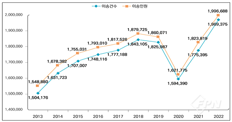 2019년과 2020년은 코로나19로 인해 예년과 비교했을 때 출동 건수가 일시적으로 감소하는 경향이 있었다. 하지만 2021년부터 매년 구급 출동 증가추세가 10%를 상회해 구급대 부하 역시 증가하는 거로 예상할 수 있다.