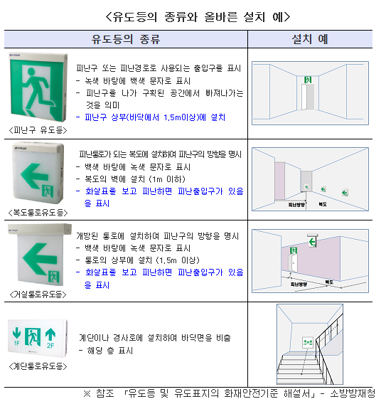 유도등은 크게 피난구유도등과 통로유도등으로 나뉘는데 피난구유도등은 피난구의 위치를 알리는 역할을 하며 통로유도등은 피난방향을 알릴뿐 아니라 피난통로의 조도를 확보하는 역할을 하고 있다. 흔히 잘못 설치되는 경우가 백화점, 마트, 주차장 등 개방된 통로에 거실통로유도등이 설치되어야 하나 피난구유도등이 설치되어 있는 경우가 많이 있으며 계단의 경우 계단통로유도등이 설치되어야 하나 복도통로 유도등이 설치되는 경우가 많다. 유도등은 설치 장소와 목적에 맞도록 설치해야 피난안전성을 효과적으로 확보할 수 있다. 때문에 소방관련 종사자들과 국민들이 소방용품 중 하나인 유도등의 올바른 설치법을 숙지하는 것은 무엇보다 중요하다. 이를 위해 4가지 유형별 유도등의 종류에 따른 설치 목적과 올바른 설치방법을 살펴보자. 우선 피난구유도등은 피난구 또는 피난경로로 사용되는 출입구를 표시하는 유도등으로 녹색 바탕에 백색 문자(사람이 뛰어 나가는 모양)로 표시가 이뤄진다. 피난구를 나가 구획된 공간에서 빠져나가는 것을 의미한다. 복도통로 유도등은 피난통로가 되는 복도에 설치해 피난구의 방향을 명시해 주는 유도등으로 백색 바탕에 녹색 문자(화살표)로 표시된다. 화살표방향으로 피난하면 피난출입구가 있음을 표시하므로 대피 시 화살표방향을 보고 피난하면 피난출입구가 나오게 된다. 이러한 복도통로유도등은 복도의 벽 1m이하 위치에 설치해야 한다. 거실통로유도등은 개방된 통로에 설치해 피난구의 방향을 명시해 주는 유도등으로 이 또한 백색 바탕에 녹색 문자(화살표 : 화살표방향으로 피난하면 피난출입구가 있음을 표시)로 표시가 이뤄지며 설치할 때에는 1.5m 이상 높이의 통로 상부에 설치토록 하여야 한다. 계단통로유도등의 경우 계단이나 경사로에 설치하여 바닥면을 비추는 역할을 해주며 해당 층에 대한 표시가 이뤄진다. 이처럼 유도등은 다양한 종류마다 각자 가진 고유의 특성과 설치법이 규정되어 있기에 최초 올바른 설치를 통한 목적 달성을 이룰 수 있도록 관련인과 국민들의 관심이 필요하다.