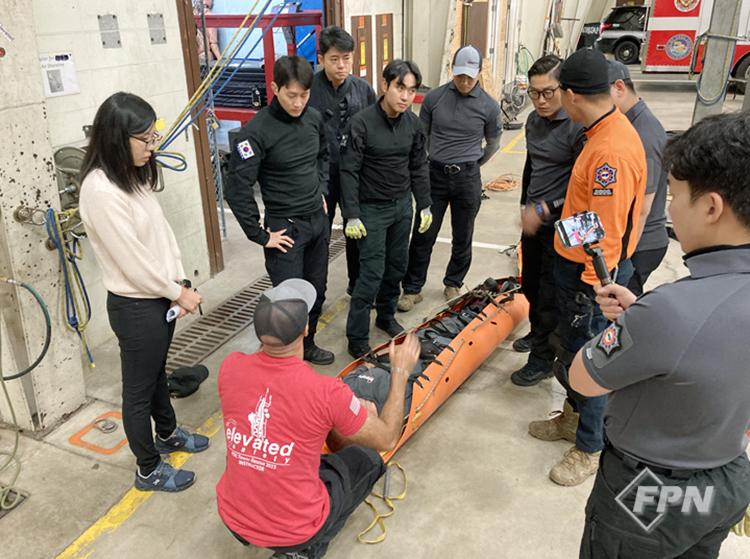 “한국에서는 몇 ㎜, 어떤 종류의 로프를 주로 사용하나요?” “구조용으로 11㎜의 스테틱 로프를 사용합니다” “미국 소방관들은 아직 12.7㎜를 주로 사용합니다. 하지만 우리 Elevated Safety 팀도 11㎜를 선호해요”