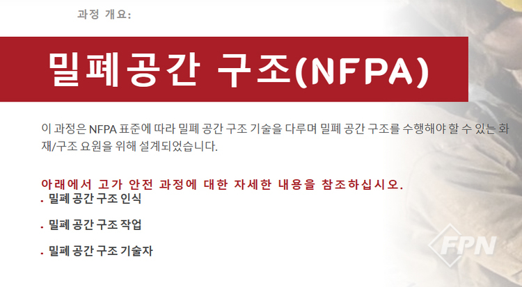그중 밀폐공간 구조 기술자과정은 사전에 개인 자격 현황을 확인한 후 제한된 공간 기술자 수준에 대한 NFPA 1006/1670(OSHA) 기준에 맞춰 4일 코스로 진행된다.