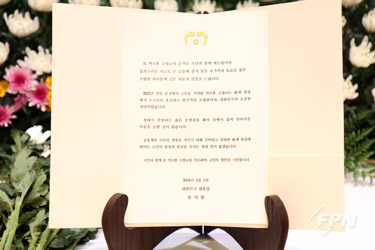 대통령 조전은 이관섭 대통령 비서실장이 대독했다. 윤 대통령은 “고 김수광 소방장과 고 박수훈 소방교는 화재 현장에서 누구보다 용감하고 헌신적인 소방관이자 대한민국의 소중한 청년들이었다”며 “장래가 촉망되는 이들을 화마 속에 잃어 안타까운 마음을 금할 길 없다”고 했다.