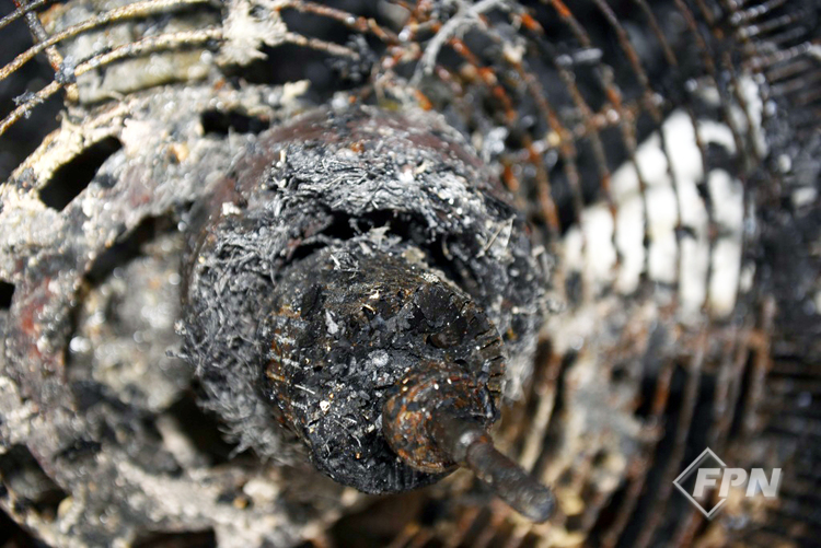 천장은 무너지고 군청색, 적 산화, 만곡 현상 등이 상단으로 진행돼 있다. 바닥은 탄화형태 없이 원형으로 유지돼 있다. 군청색으로 변색한 안과 밖을 세밀히 살피던 중 선풍기로 연결된 전선에서 용융 흔적이 관찰됐다.