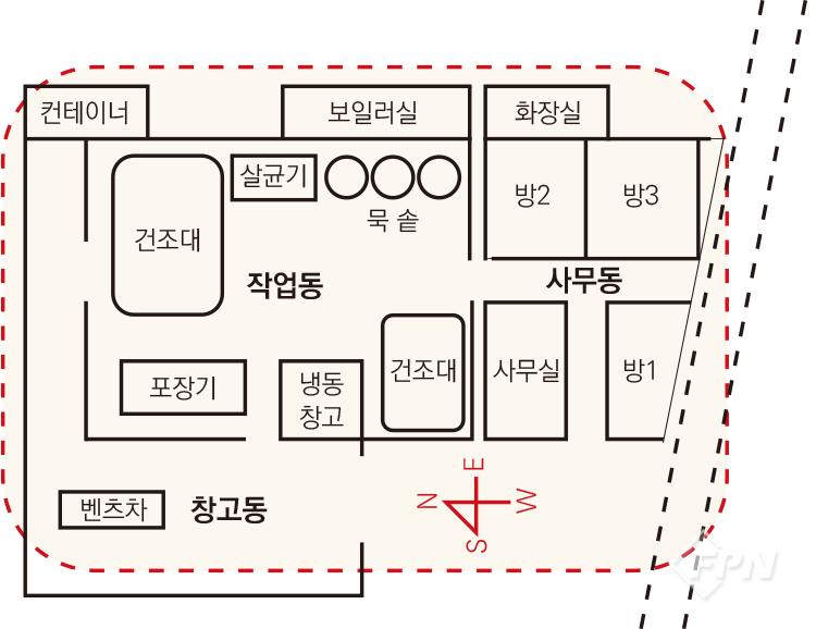 평면도를 그려라! 공장 내부 기계나 작업대 등 구조를 그려 놓고 현장을 확인하는 게 현장에 대한 이해도 빠르고 작업 공정을 한눈에 확인할 수 있다. 공장 내부에 소형 건조대와 묵 솥, 냉동창고, 포장기, 살균기, 대형 건조대, 그리고 외부에 보일러실, 숙소용 컨테이너가 있다. 평면도 오른쪽으로 화장실과 방 1, 방 2, 방 3, 사무실이 있는 곳은 관계자 최 씨가 거주하는 주택이다.