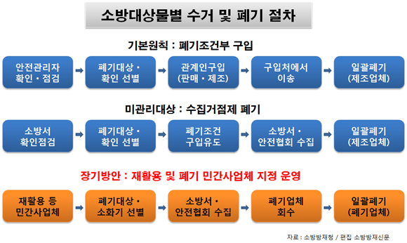 이에 따라 폐기가 필요한 소화기는 새로운 소화기 구입시 해당 업체에 반환할 수 있도록 하고 이 외의 폐기 처분이 필요한 소화기는 각 소방관서에 수거지원센터를 설치해 회수해 나가기로 했다. 장기적으로는 재활용이나 폐기를 담당하는 민간사업체를 지정운영할 계획이다.