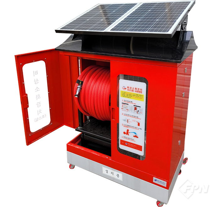 이 장치는 태양광 패널과 컨트롤러, 배터리, 인버터, 가압펌프, 드럼, 호스릴, 비상소화장치함 등으로 구성된 슬라이드 방식 드럼이 적용됐다. 앞뒤나 좌우 등 원하는 방향으로 소방호스를 전개할 수 있으며 ‘ㄱ’자 형태로 구현된 문을 열면 완전 개방돼 편리한 진압 환경을 제공한다.