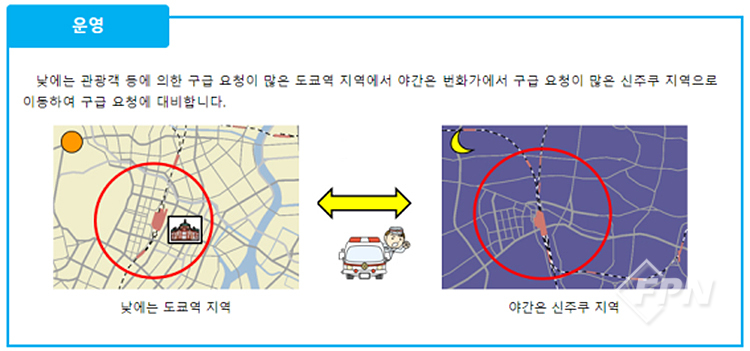 일본 도쿄 소방청의 구급 기동부대도 좋은 사례다. 도쿄 소방청에서는 일근 구급대를 포함한 도쿄 기동 구급대를 운용한다. 주간 시간대에는 유동 인구가 많고 환자가 많이 발생하는 도쿄역에 구급차를 전진 배치시킨다. 야간에는 유흥 업소가 많은 신주쿠역으로 이동해서 배치한다.