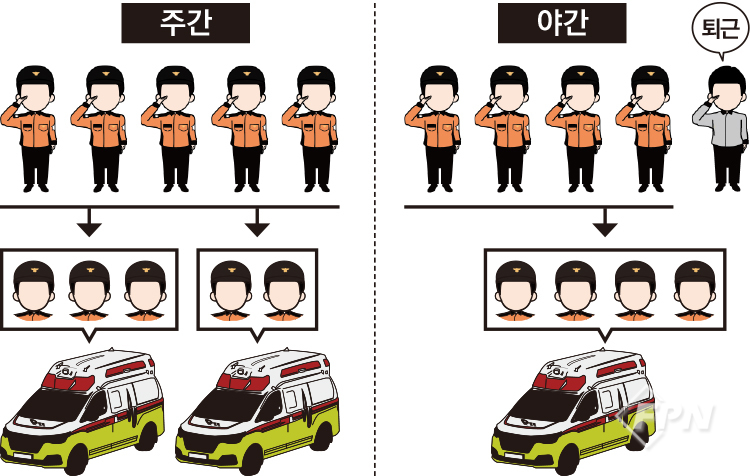 5명 중 1명만 일근 구급대로 근무하고 오후 6시에 퇴근하면 4명이 남게 되는데 오후 6시 이후에는 ‘1구급대-4인 체제’로 돌아가면서 휴식을 취할 수 있다. 5명의 구급대원 중 1명이나 2명이 휴가를 가더라도 1대의 구급대는 운용할 수 있어 탄력적인 관리가 가능하다.