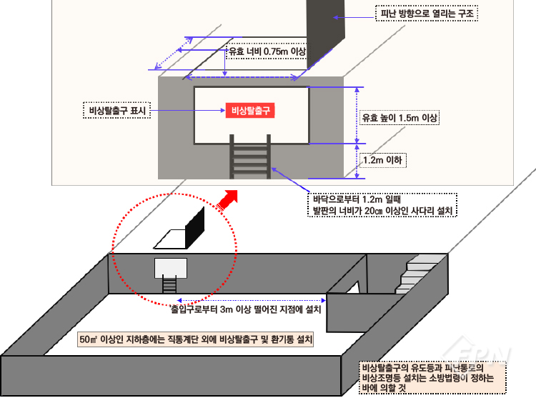 비상탈출구 설치 세부기준 비상탈출구는 지하에서 지상 외부로의 피난을 위해 필수로 확보돼야 할 최소한의 구조다. 그러나 설치에 관한 법의 변천 과정을 보면 지하층 설치 의무화 규정이 시행되던 시기(1970. 03. 02.)에는 비상탈출구의 설치 규정이 없었다.