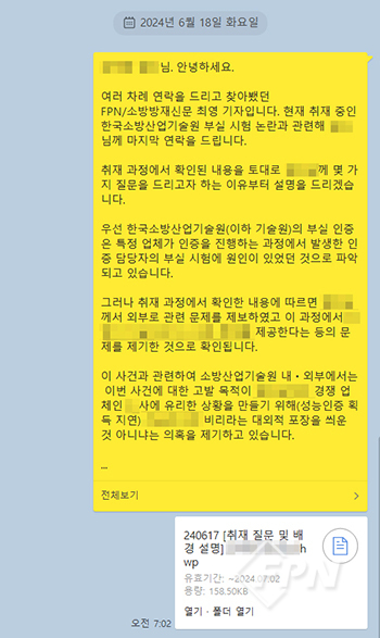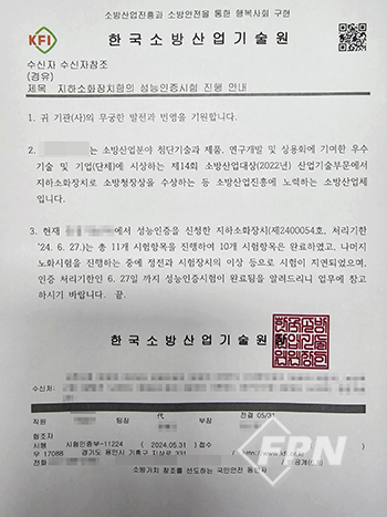 ![]() ▲ 한국소방산업기술원이 시험기 오조작 문제 발생 후 해당 피해 기업과 수요기관에 보낸 공문 © FPN |