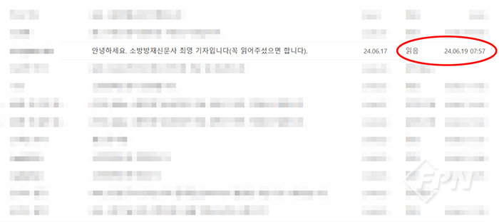![]() ▲ 제보자인 법무법인 인사에게 보낸 이메일의 수신 확인 내역을 보면 6월 19일 오전 내용을 읽은 것으로 표시된다. © FPN |