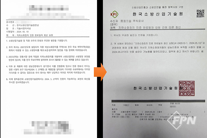 5월 20일 A 사에 보낸 공문에는 ‘지하소화장치 인증 완료일자 요청 건에 따른 회신’이라는 제목이 적혀 있다. 본문에는 ‘귀 사에서 문의하신 “지하소화장치 인증 완료 일자 회신 요청”과 관련하여 현재 진행 중인 귀사의 지하소화장치함이 성능인증에 부적합 사항이 없을 시 2024. 05. 27까지 인증 승인이 가능함을 알려드리오니 업무에 참고하시기 바랍니다’라는 내용이 담겼다.