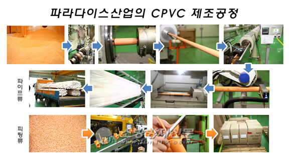 최고 품질 비결은 “차별화된 원재료와 생산시설”CPVC는 배관은 제조 원료와 접착제(시멘트)를 물론 안정적인 생산설비가 품질을 좌우하게 된다. 파라다이스산업은 미국 Lubrizol사로부터 원재료를 국내에 독점으로 공급받고 있다. 전세계 60% 이상의 점유율을 보유한 CPVC 원재료의 대표적 기업이다.