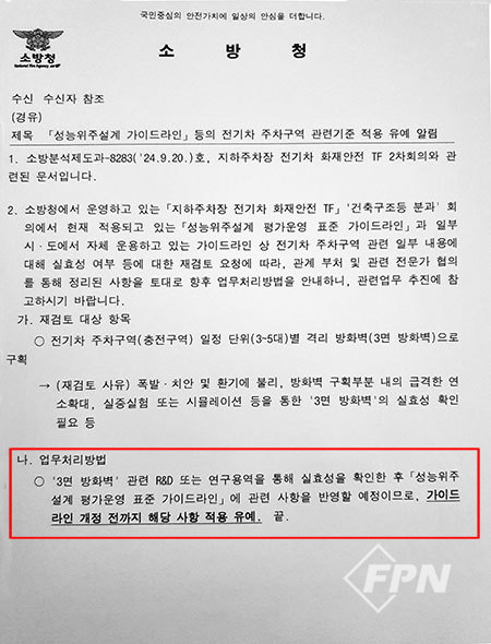 소방청이 지난 4일 이 같은 내용이 담긴 ‘전기차 전용(충전)구역 관련 기준 적용 유예 알림’ 지침을 전국 소방관서에 시달한 것으로 <FPN/소방방재신문> 취재 결과 확인됐다.