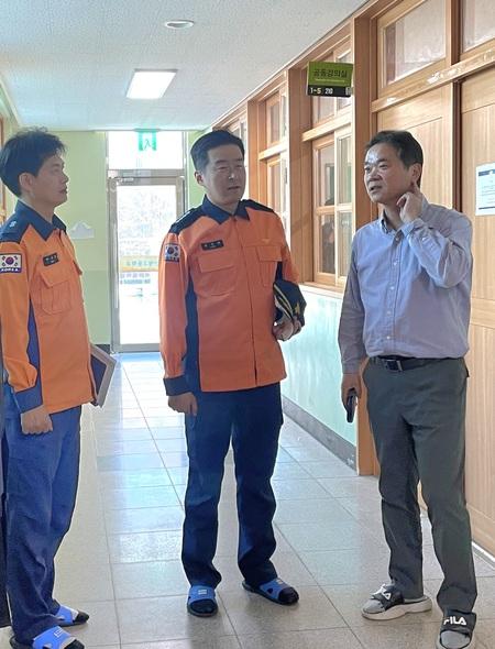 이날 윤진희 서장은 산청고 교장과 함께 시험장의 안전관리 상태를 점검하고 사고 발생 시 따라야 할 대피 동선을 중점적으로 확인했다.