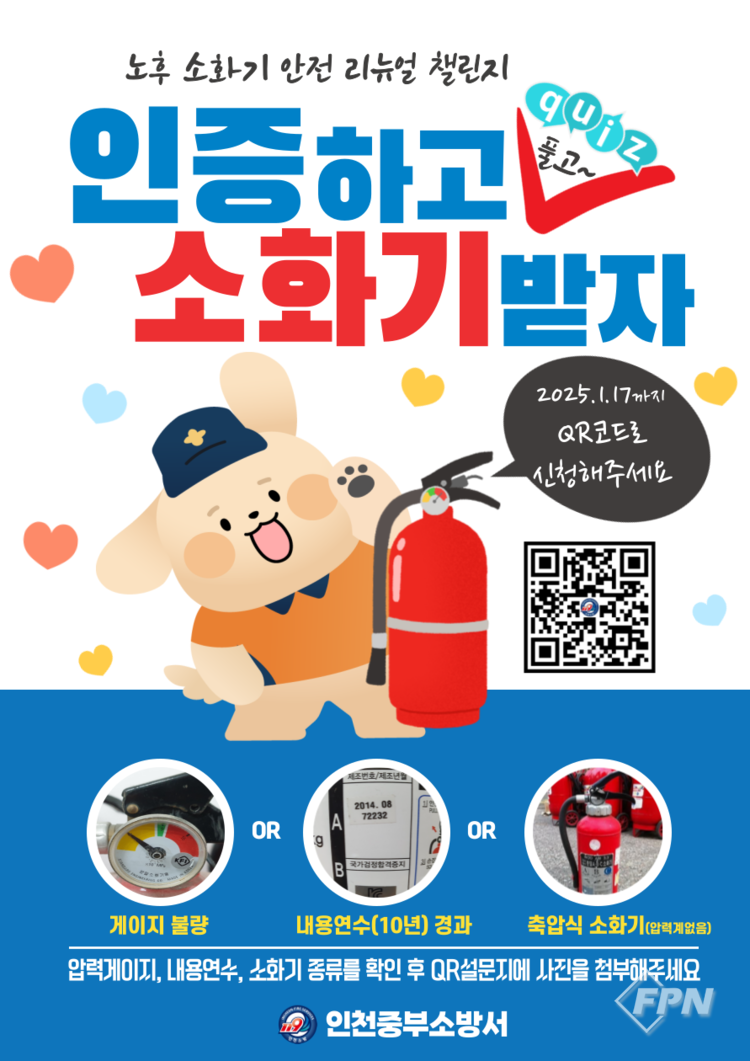 [FPN 정재우 기자] = 인천중부소방서(서장 김현)는 시민을 대상으로 ‘2025년 노후 소화기 안전 리뉴얼 챌린지’ 이벤트를 추진한다고 19일 밝혔다.