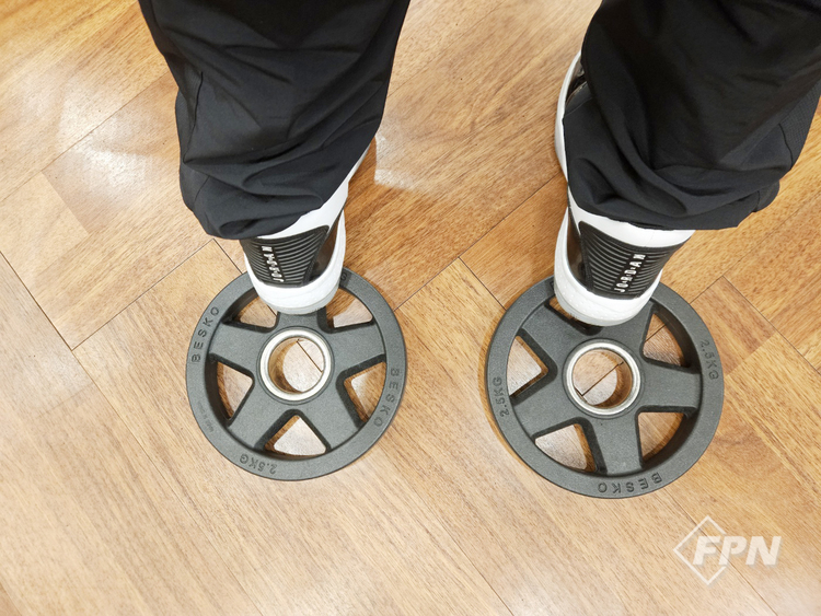 • 2.5㎏ 원판을 준비한 뒤 스쿼트 하기 전 발 뒤편에 깔면 더 안정적으로 운동하실 수 있습니다. • 발목 가동성이 떨어지면서 가슴 앞쪽으로 무게 중심을 잡고 스쿼트해도 균형을 잡기 힘들 때 유용합니다.