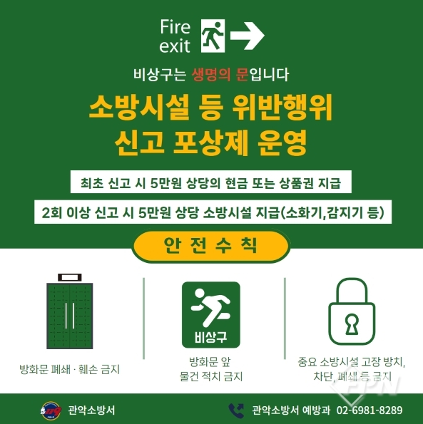 [FPN 정재우 기자] = 관악소방서(서장 정윤교)는 소방시설 등 불법행위 신고포상제를 운영 중이라고 14일 밝혔다.
