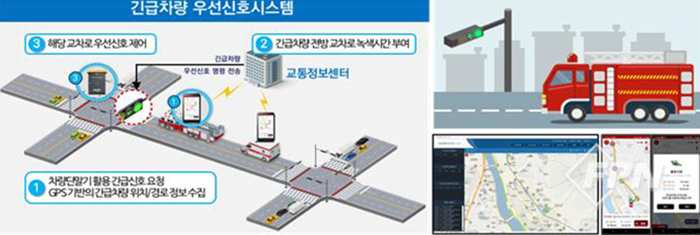 지능형교통체계는 실시간 신호정보 개방과 스마트 감응 신호, 실시간 신호제어, 긴급차량 우선신호 시스템으로 구성된다.