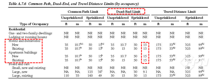 NFPA 101 인명안전코드에서는 용도별 막다른 복도의 거리 제한을 정해 놓았는데 일반적으로 스프링클러 설비가 설치된 곳에 대해선 15m 이내로 설치하도록 하고 있다.
