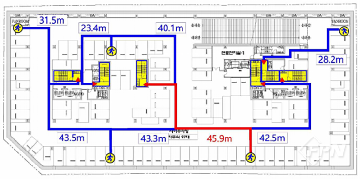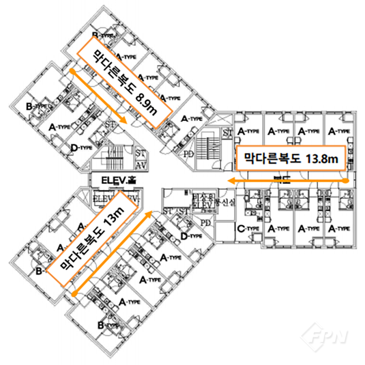 이런 상황에서 복도의 길이가 길다면 피난에 많은 시간이 소요되고 연기의 확산 등에 의한 피난 중 인명피해가 발생할 우려가 있다.