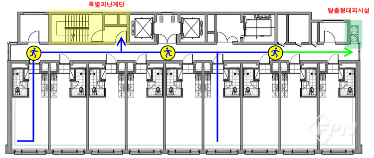 오피스텔은 특별피난계단까지의 보행거리를 법적 기준에 적합하게 계획하였으며, 양방향피난이 가능하도록 복도 끝에 탈출형대피시설을 추가 설치하였습니다.