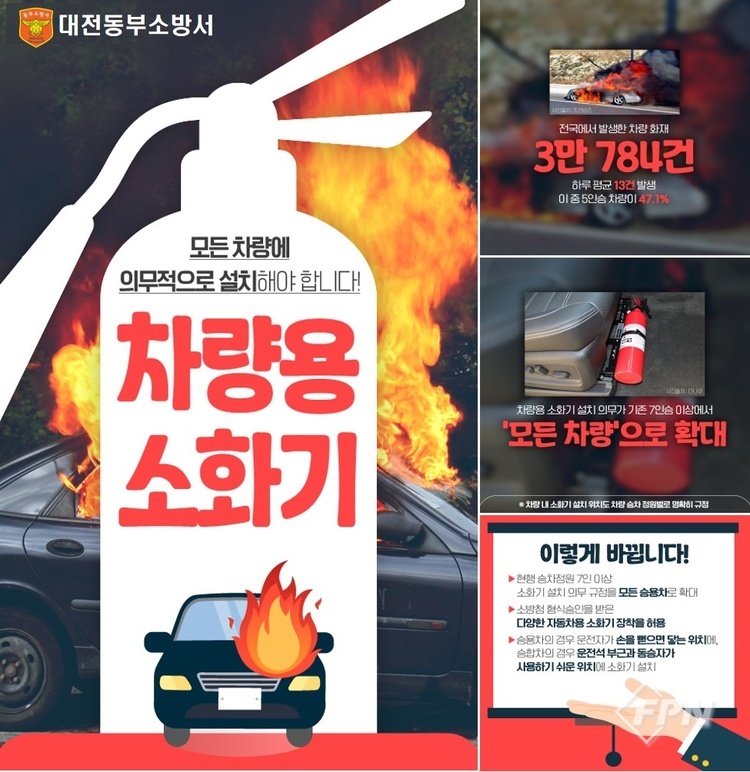 [FPN 정재우 기자] = 대전동부소방서(서장 신경근)는 최근 발생한 차량 화재 사례를 소개하며 차량용 소화기 비치에 대해 당부한다고 7일 밝혔다.