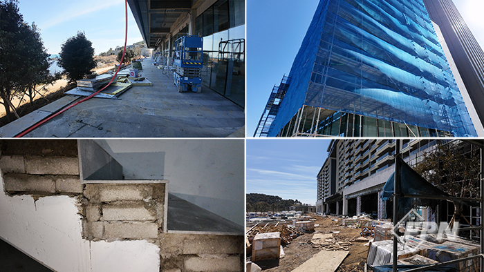 화재 사고 3일 후 현장에서 마주한 부산 반얀트리 리조트는 도저히 사용승인이 완료됐다고는 믿기 힘들 정도의 외관을 갖추고 있었다. 외벽 곳곳엔 아직도 외장재 마감이 완료되지 않은 데가 많았고 건물 옥상 부근엔 철골조가 그대로 노출돼 있는 등 건축공사가 한창 진행 중인 모습이었다.