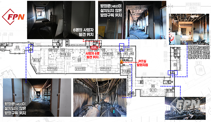 하지만 지난 17일 <FPN/소방방재신문>이 박경환 회장과 현장을 직접 찾아 확인한 결과 건축 도면상 방화구획 위치에 반드시 존재해야 하는 방화셔터가 아예 설치되지 않았던 것으로 확인됐다. 방화구획 자체가 형성되지 않아 희생자들이 발견된 장소까지 연기가 급속도로 번졌을 가능성이 커 보이는 정황이다.