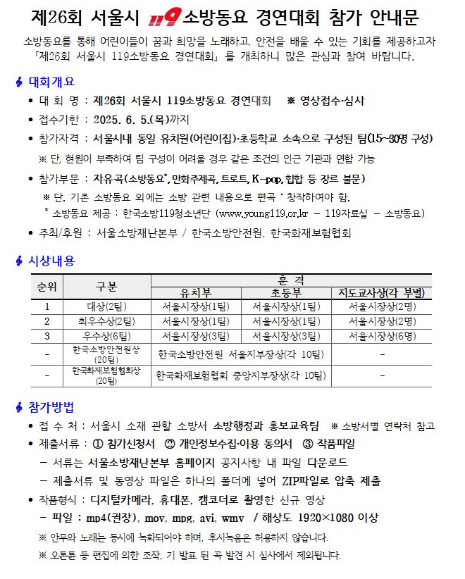 - 관악소방서, ‘제27회 서울시 119소방동요 경연대회’ 참가팀 모집