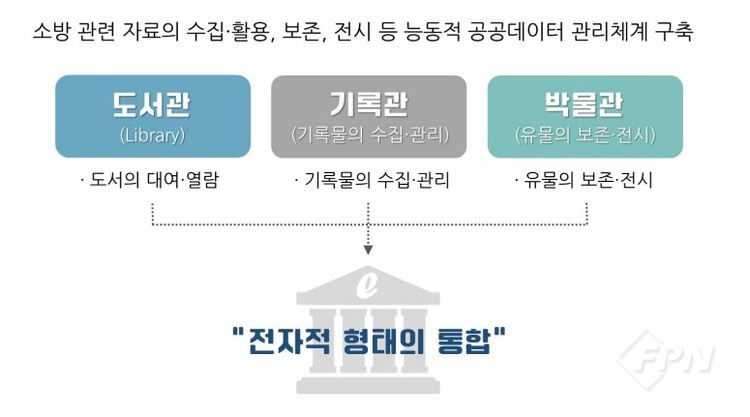 위원회는 장기적으로 ‘소방 E-라키비움’을 구축해야 한다고 강조한다. ‘라키비움(Larchiveum)’은 ‘Library’와 ‘Archives’, ‘Museum’을 혼합해 만든 신조어로 도서관과 기록관, 박물관의 기능을 지닌 지식정보 집합체를 의미한다.
