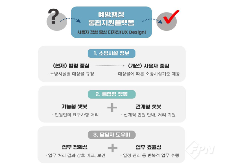 소방시설 설치기준에 관한 정보 제공 방식을 사용자 중심으로 개선하고 ‘통합형 챗봇’과 ‘예방 업무 담당자 도우미’를 탑재한 게 특징이다.